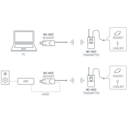Receptor USB, compatible con Windows/Mac y salida de audio adicional para monitorización o amplificación.